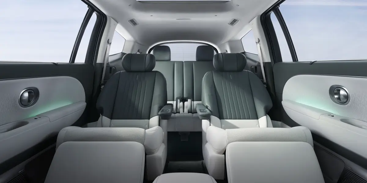 Relaxation-setene med benstøtter leveres til 1. og 2. seterad. De kan legges bakover, slik at opptil fire personer kan lene seg tilbake og slappe av mens bilen lader.